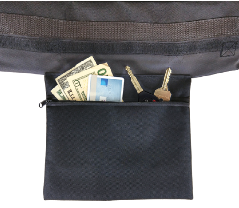 Personal Wheelchair Bag * Universally sized to fit most standard and bariatric wheelchairs - up to 26" wide wheelchairs! * Effective, practical and convenient * An amazing mobility solution that allows the wheelchair user to conveniently and comfortably taje their belongings with them and access them easily * Two large pockets with hook and loop closures hold all your belongings, including larger items such as laptops, purses, books and so much more! * Tested to hold up to 25 lbs. of personal items * Simple to attach with quick-click buckles and adjustable hanging straps - no tools required * Included shoulder strap makes this bag easy to carry when removed from wheelchairs * Internally hidden zippered 7..5" x 8.5" security pocket securely holds important items such as keys, wallets or money * Large main pocket 16.5" L x 16.5" W * Mesh exterior pocket dimensions 13" L x 16.5" W * Overall dimensions 18" L x 16.5" W *