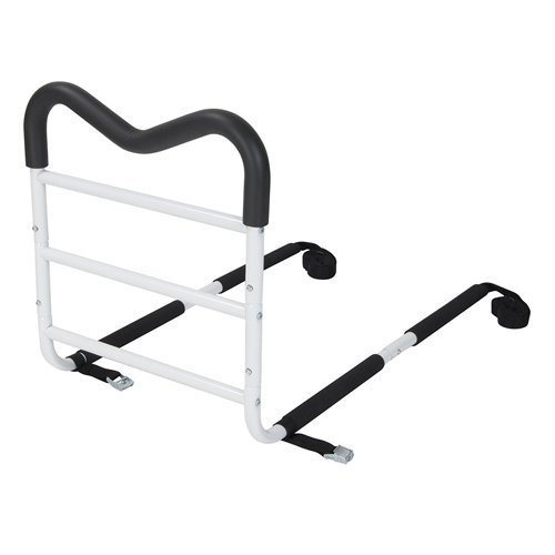Designed to provide support when getting into and out of bed and when moving from a lying position to a sitting position. * M shape allows for multiple hand positions to accommodate any user. * Multiple crossbars creates easy grip for any height use. * Easy, quick assembly. * Safety strap wraps around mattress or box spring to ensure a secure fit. * Special extra-long safety strap enables user to be in a single, twin, double, queen or king size bed. * Made of powder coated steel for long life and easy cleaning. * Includes accessory pouch for storing remote controls, glasses, magazines and more. * 300 lb. Weight Capacity. *