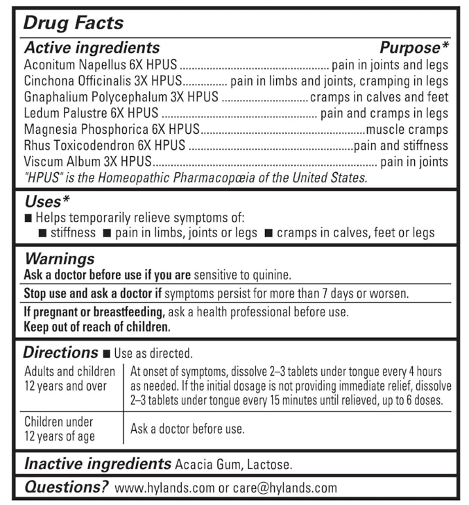 Ingredients : acacia gum;lactose;aconitum napellus 6x hpus purpose pain in joints and legs cinchona officinalis 3x hpus purpose pain in limbs and joints; cramping in legs gnaphalium polycephalum 3x hpus purpose cramps in calves and feet ledum palustre 6x hpus purpose pain and cramps in legs magnesia phosphorica 6x hpus purpose muscle cramps rhus toxicodendron 6x hpus purpose pain and stiffness viscum album 3x hpus purpose pain in joints