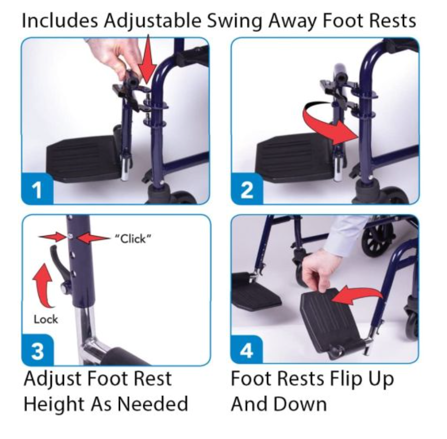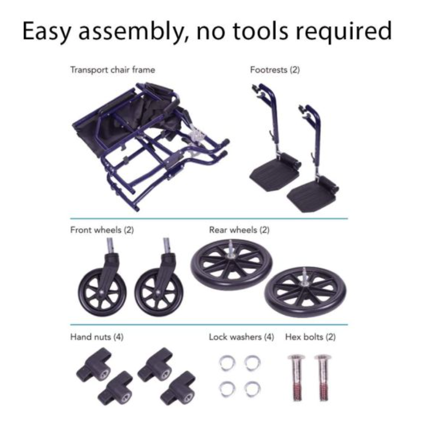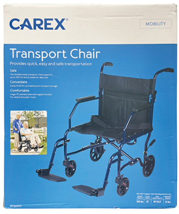 Features oversized 8” wheels for easy maneuverability and a smooth glide * The swing-away footrests and folding features allow for compact storage and transportation - an excellent choice for safe sturdy and comfortable portability * No assembly required * Supports up to 300 lbs. * The steel transport chair is durable and made for daily use * Ideal for anyone looking for a heavy-duty transport chair * Adjustable swing-away footrests for leg support * The removable footrests offer a source of support when in use * They can be removed for storage and transport * Large 19” seating provides luxurious comfort * Comfort is critical with any mobility aid * The lightweight transport chair sports a comfortable 19” seat with plenty of room * 8” wheels provide smooth gliding and easy maneuvering * The foldable lightweight transport chair offers easy moving with oversized wheels * Perfect for numerous terrains * It can turn tight ideal for confined spaces such as hallways * Features a seat belt for added safety * The folding transport chair's seat belt ensures the user is safe when riding * It helps keep them in place and comfortable when seated * Easily folds for quick storage and transport * The Carex Transport Chair folds easily to fit in tight spaces such as car trunks * It's an excellent transfer chair for anyone in need of a light transport chair for travel * Weighs only 25 lbs. * Companion transport chairs are most commonly used because of their light weight * Padded seat & backrest *