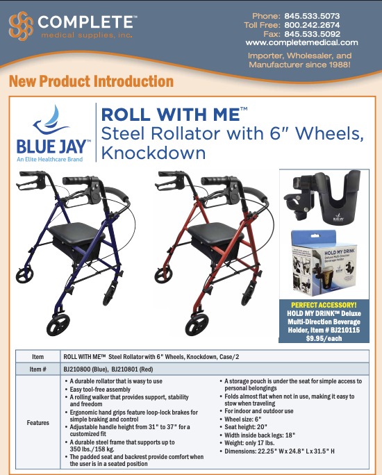 Knock down (Assembly Required) Steel Rollator with easy and simple tool free assembly * Blue * Case/2 * Durable steel frame * Ergonomic hand grips feature loop-lock brakes for simple braking and control * Adjustable handle height from 31" to 37" for a customized fit * The padded seat sand backrest provides comfort when the user is seated * A large storage pouch under the seat is included for simple access to personal belongings * Folds almost flat when not in use making it easy to stow when traveling * For indoor and outdoor use * Wheel size: 6 inch * Weight: 17 Lbs * Weight Capacity: 350 Lbs. * Warranty: 2 years * BJ210115 Hold My Drink Deluxe Multi-Direction Beverage Holder is the ideal accessory for this (and every) rollator *