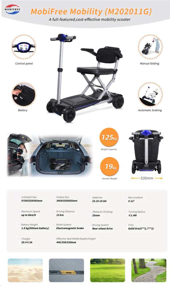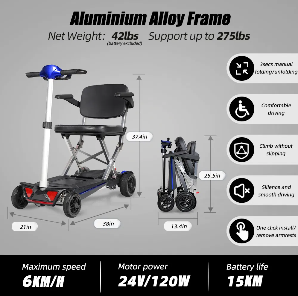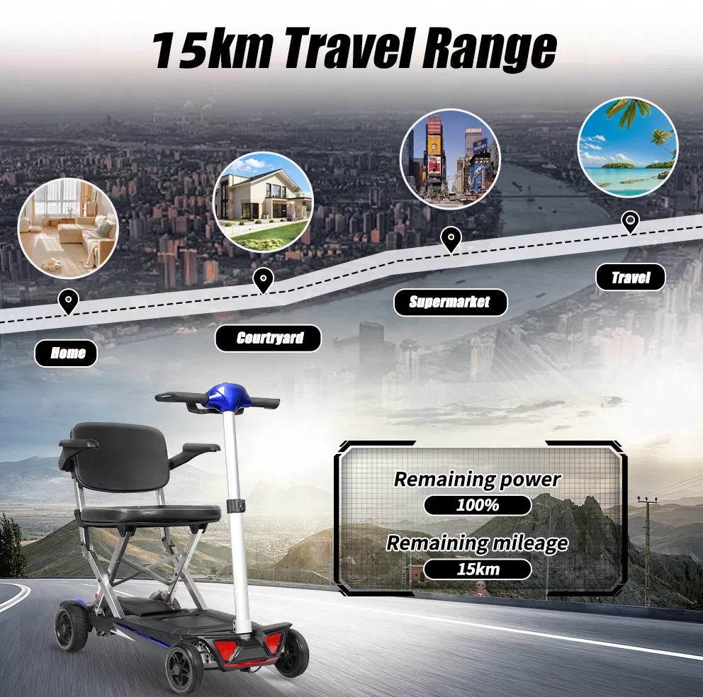 Easy 3 sec. manual folding/unfolding Spin riveting technology, it can be easily placed in the trunk, accompanying you to travel and record life wherever you want to go.Experience unique 4-wheel mobility. From the endless excitement of freedom and independence, to exceptional portability, you can imagine your life without limits! Being able to keep up with your active lifestyle and living your best means everything to you, and now with the M2020, you can enjoy the versatility of driving a compact mobility scooter that fits your every need. It is so easy to transfer it from your home, into your car, then to your destination.