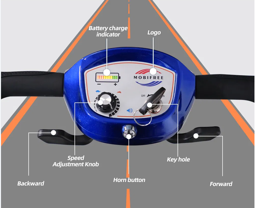 Enjoy maximum stability and superior performance with MOBIFREE 4-wheel mobility scooters. Enjoy a 1.2M turning radius with the M2020 electric scooter and navigate tight corners and small spaces effortlessly. Our mobility scooters are engineered and factory tested to ensure consistent and top performance.Other features include the straightforward, standard tiller. Its functional design puts you in control of your mobility scooter experience. For motorized scooters that are easy to use and extremely versatile, consider MOBIFREE 4-wheel mobility scooters.